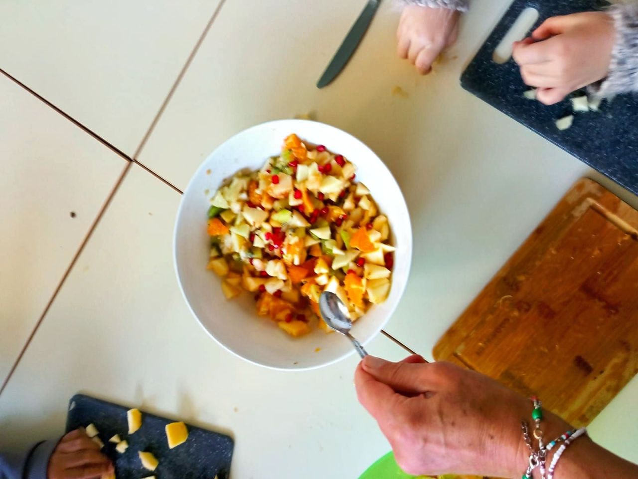 Lundi et mardi, les enfants ont fait une salade avec les fruits apportés par chacun d'entre eux. (poires, pommes, clémentines, oranges, mangues, grenades, kiwis)